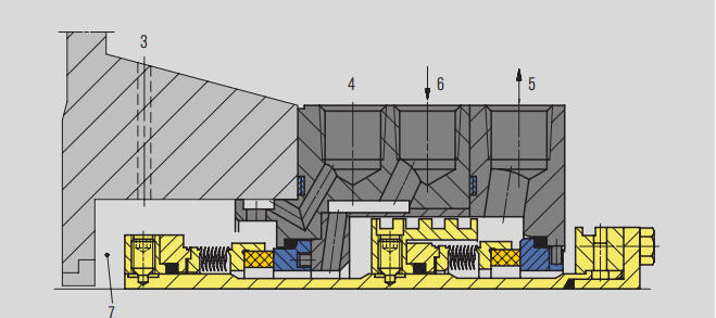 Používa otvory na riadenie prietoku na obmedzenie prietoku preplachovacej kvapaliny k mechanickému tesneniu.